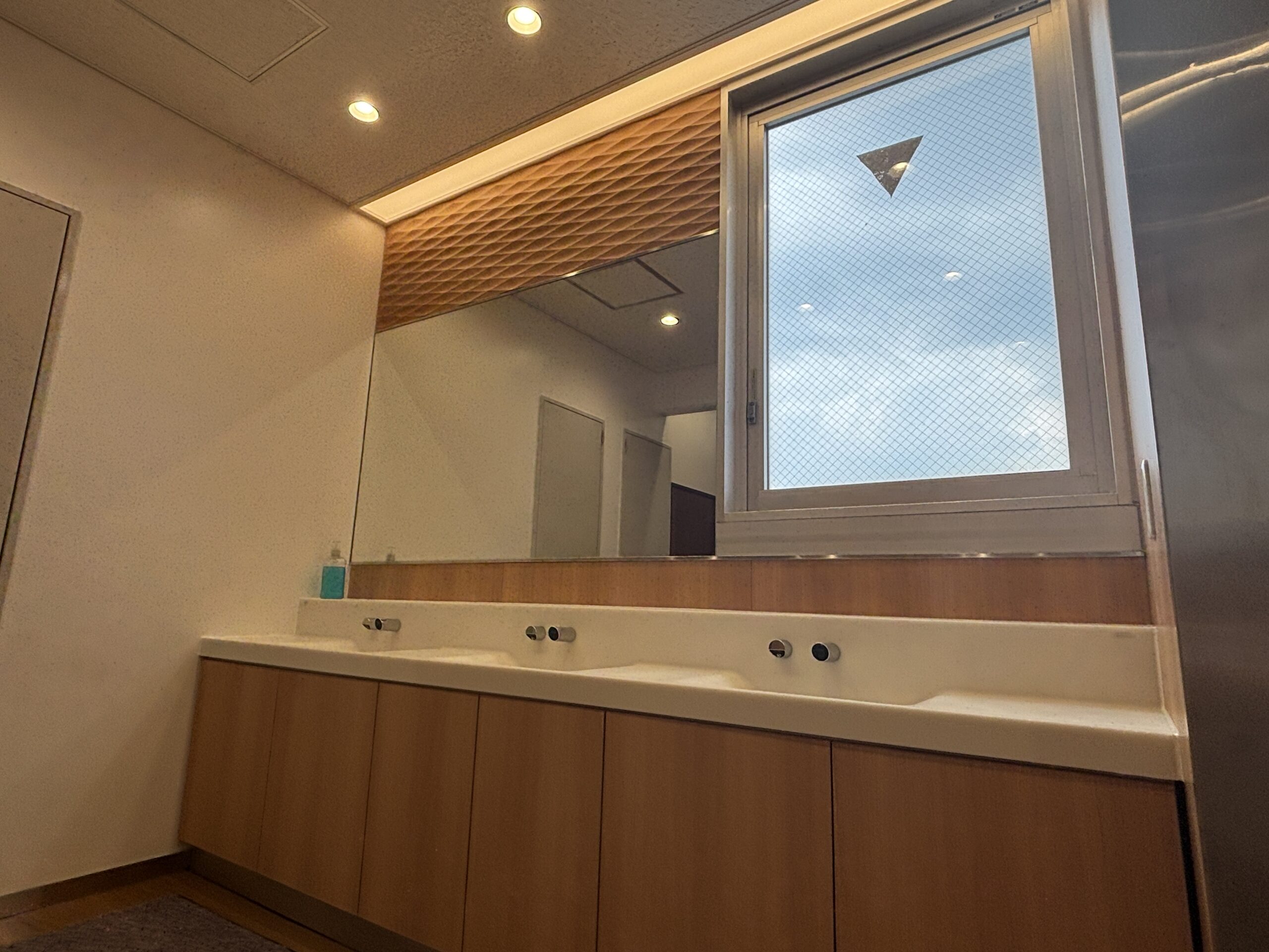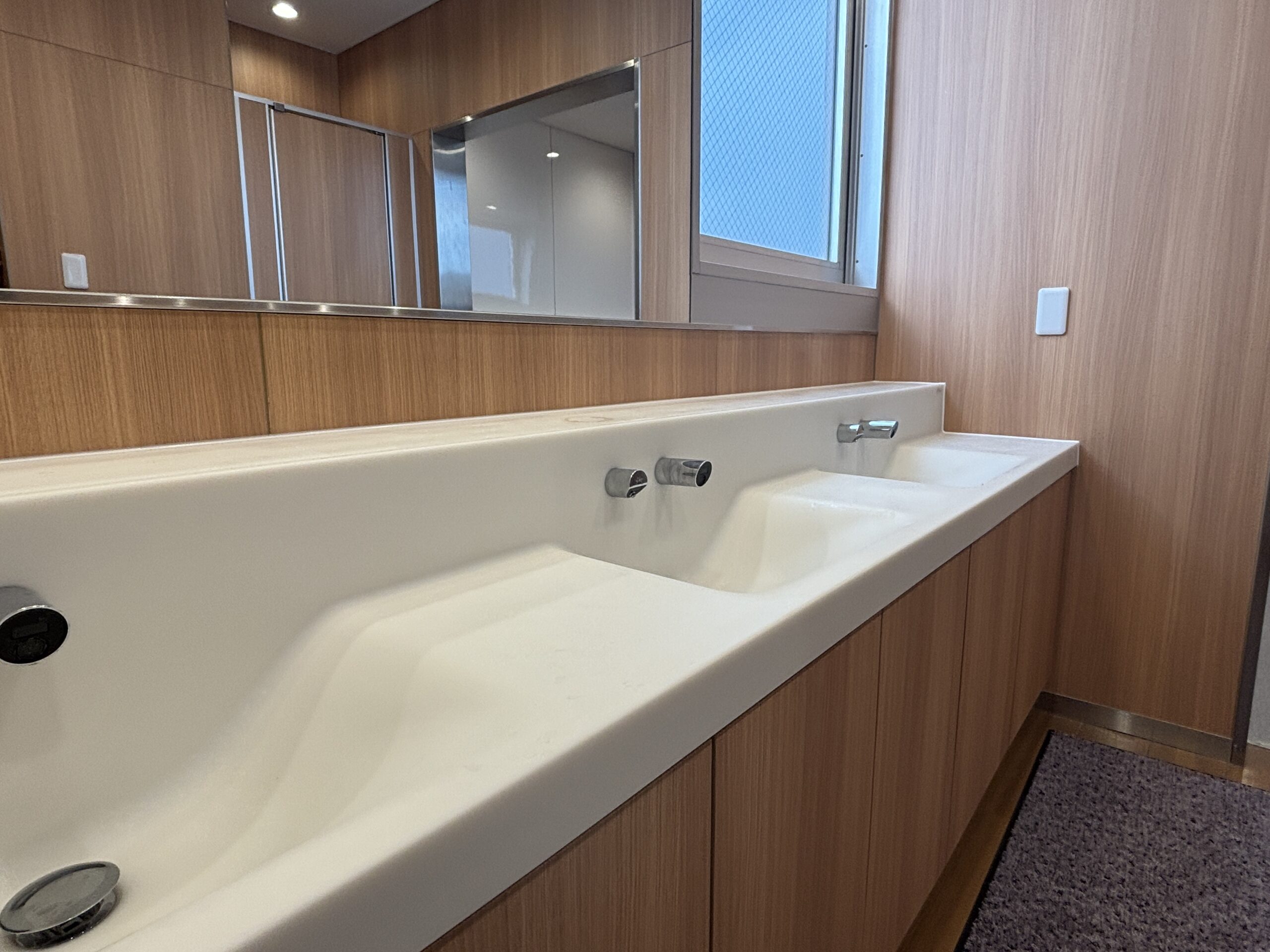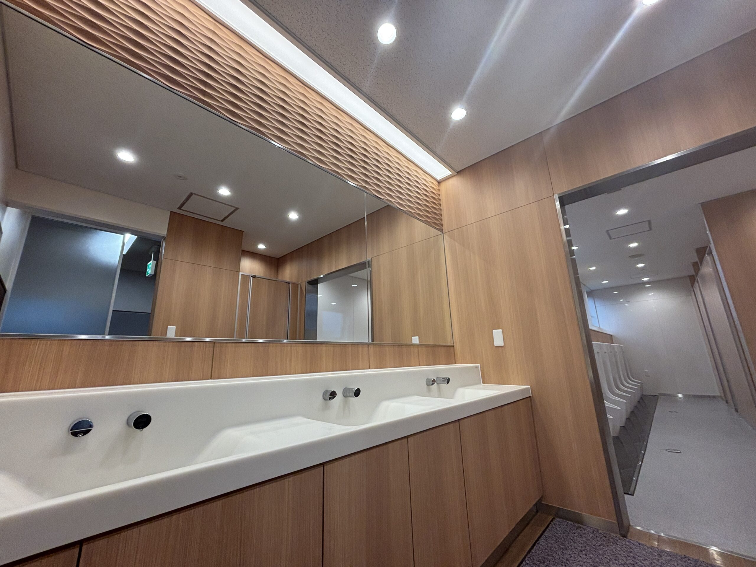 このようなご要望を受け計画立案・素材・照明など集中して打ち合わせをさせていただきました。夏休みの限られた日程及び連日の猛暑の中、無事完了できました。 完成後、女子学生から『いいな~男子トイレだけきれいになって。女子トイレも早くしてほしいな~』と・・・。女子トイレは以前にされてるんですけど。